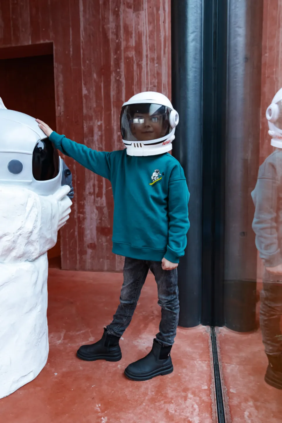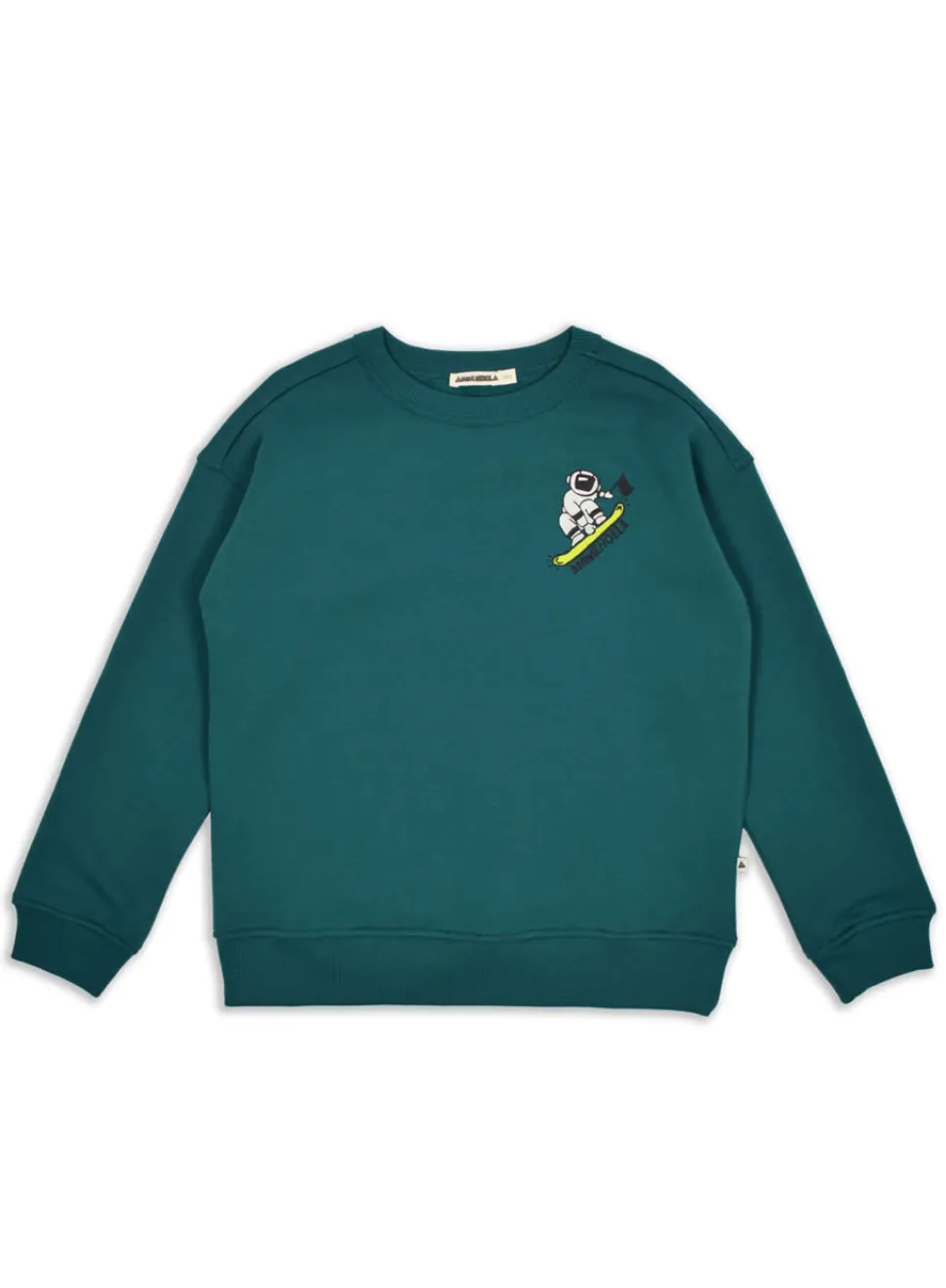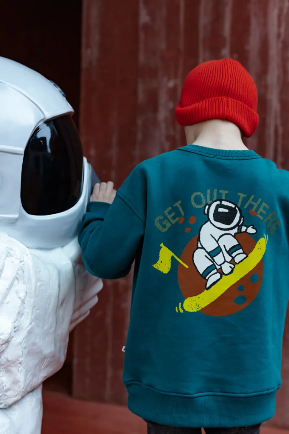 Toffe Sweater Met Ulta Coole Backprint In Astronauten Thema. Op De Borst Voorop Staat Ook Een Klein Printje, Achterop Een Grotere. Super Stoer En Een Prachtige Kleur Spruced Up!