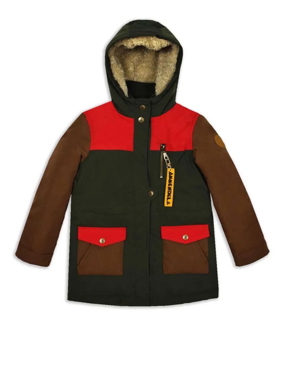 Deze Coole Colorblock Winterjas Heeft Zulke Gave Verrassende Kleuren! We Houden Van De Mooie Knalrode Details Op Deze Groen Met Bruine Jas. Heerlijk Warm Met Diverse Reflecterende Onderdelen.
