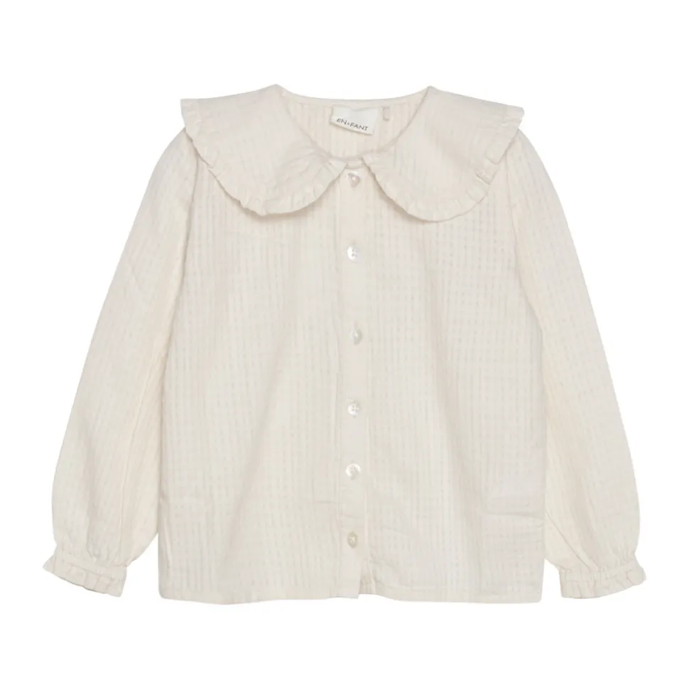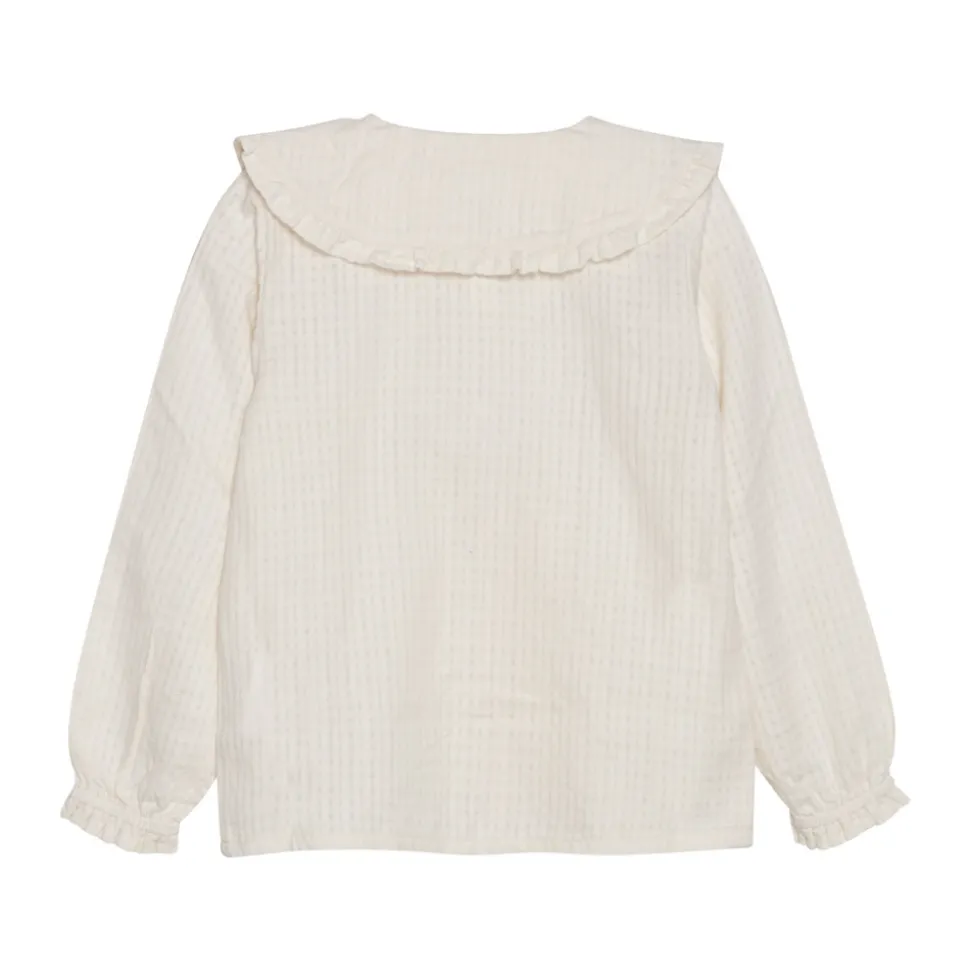 Prachtige Woven Blouse In Mooie Lichte Kleur Met Collar Kraag. Subtiel Frill Randje Aan De Mouwen En Mooie Glanzende Knoopjes.