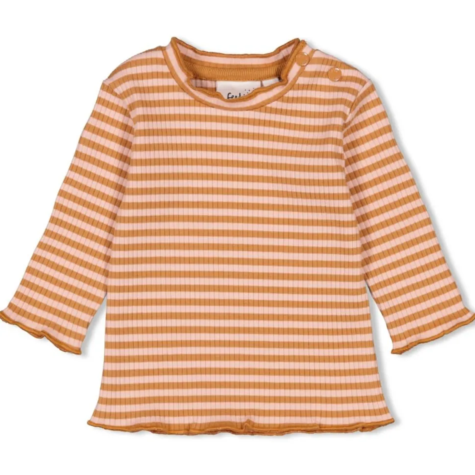 Liefste Longsleeve Van Zachte Fine Rib Stof. Met Streepjes In Camel En Lichtroze. Fris En Schattige Top. Met Drukknoopjes Op De Schouder.