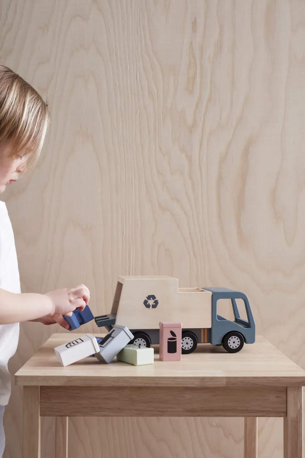 Time To Recycle! Wooden Rubbish Truck With Four Sorting Bins For Recycling. The Bins Can Be Placed On The Lift At The Back And Lifted Up Into The Truck. The Bins Have Different Symbols For Paper, Glass, And Metal.
