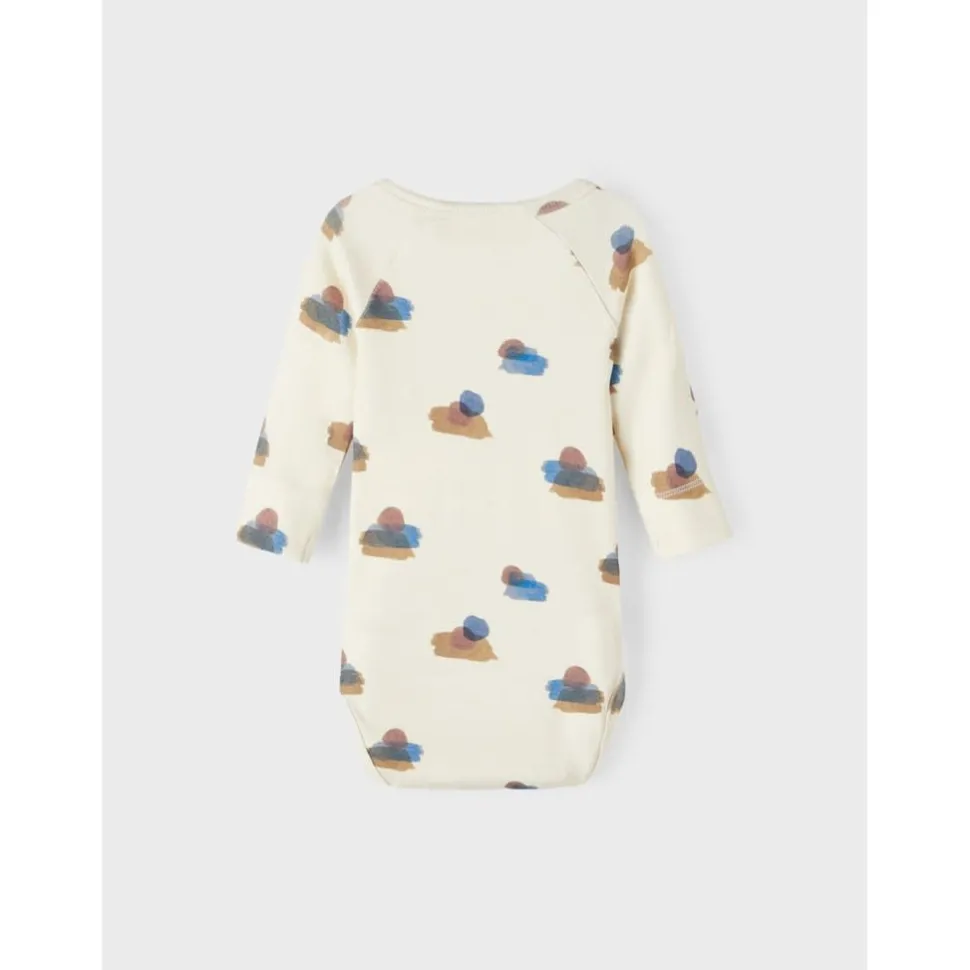 Toffe Romper Met Abstracte Zonsondergang Print, Met Mooie Kleurtjes Bruin En Blauw. Fijne Elastische Fit En Een Houten Knoopje Voor. Valt Ruim.