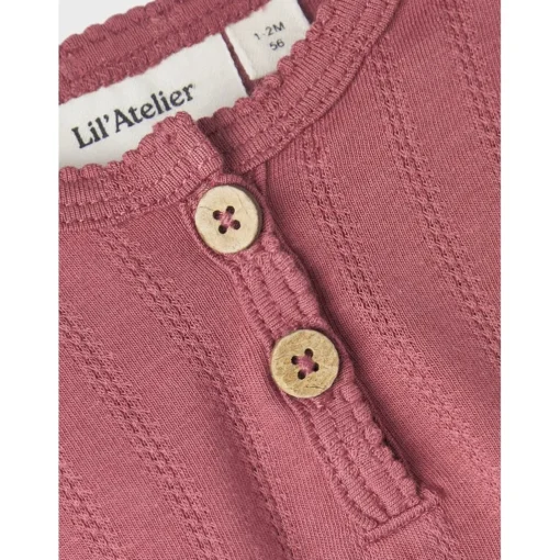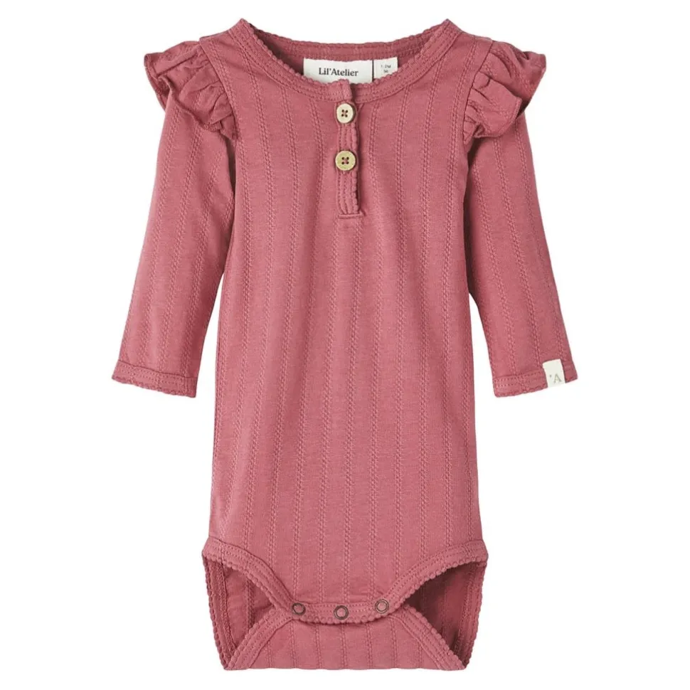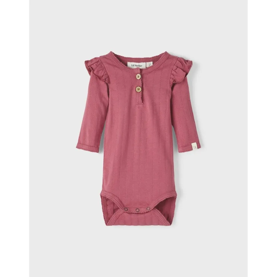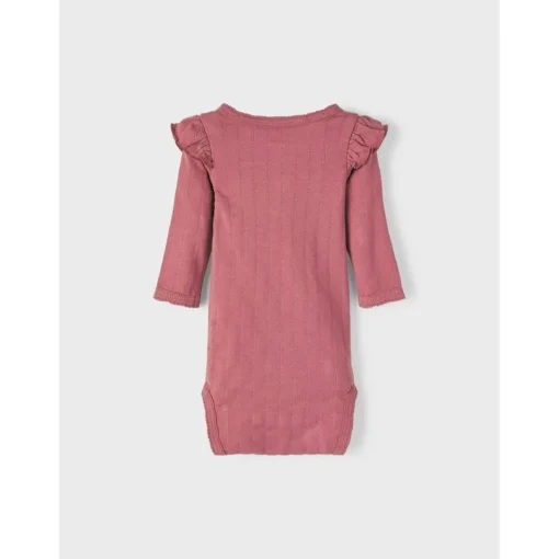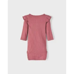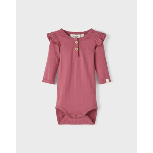 Fijne Lichte Romper Met Lange Mouwen En Frill Aan De Schouders. Voorop Twee Houten Knoopjes. Mooie Warme Kleur!