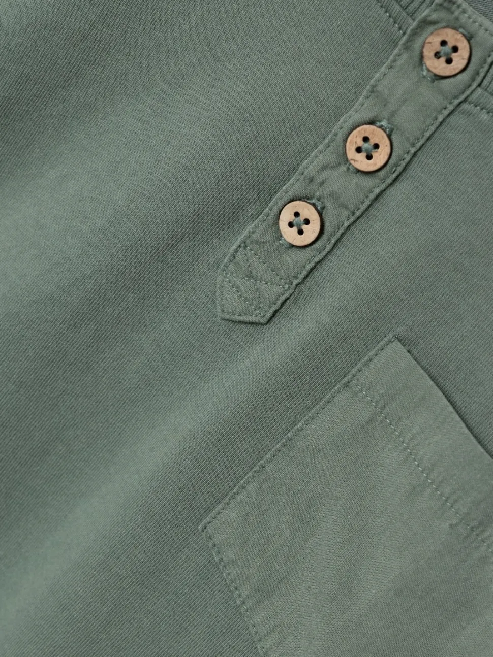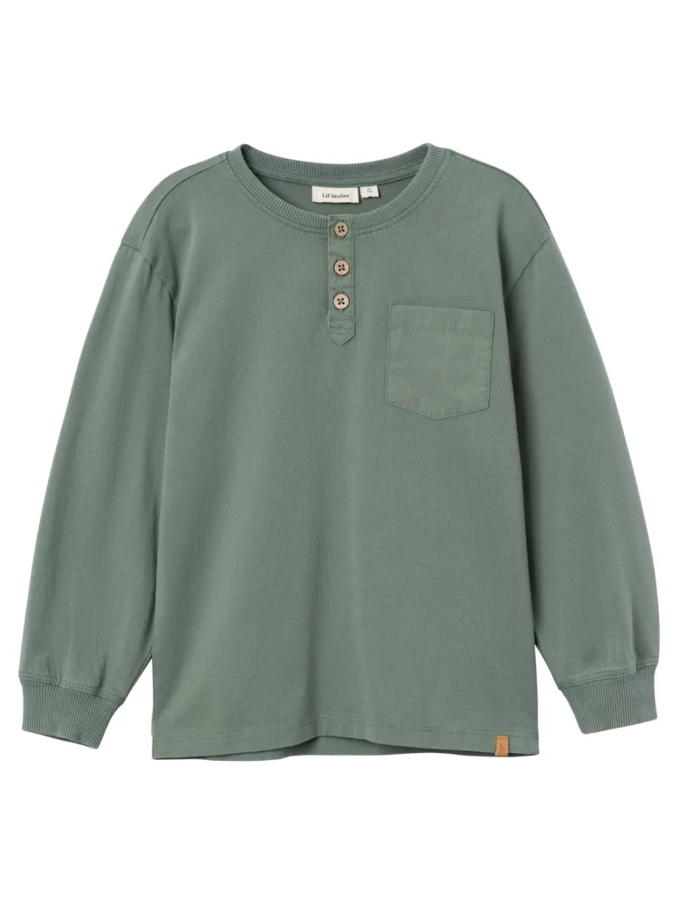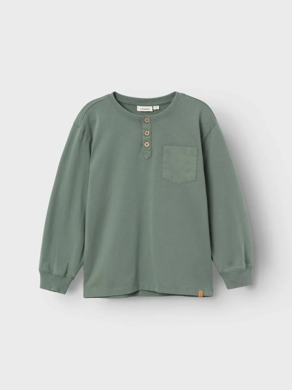 Mooie Longsleeve In Oudgroene Kleur. De Boorden Sluiten Mooi Aan Er Op De Borst Zit Een Licht Contrasterend Borstzakje. Voorop Zitten Ook Houten Knoopjes.