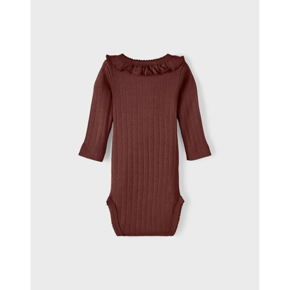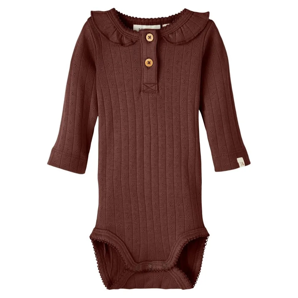 Lieve Romper Met Een Drop Stitch Patroon In De Mooie Rum Raisin Kleurige Stof.