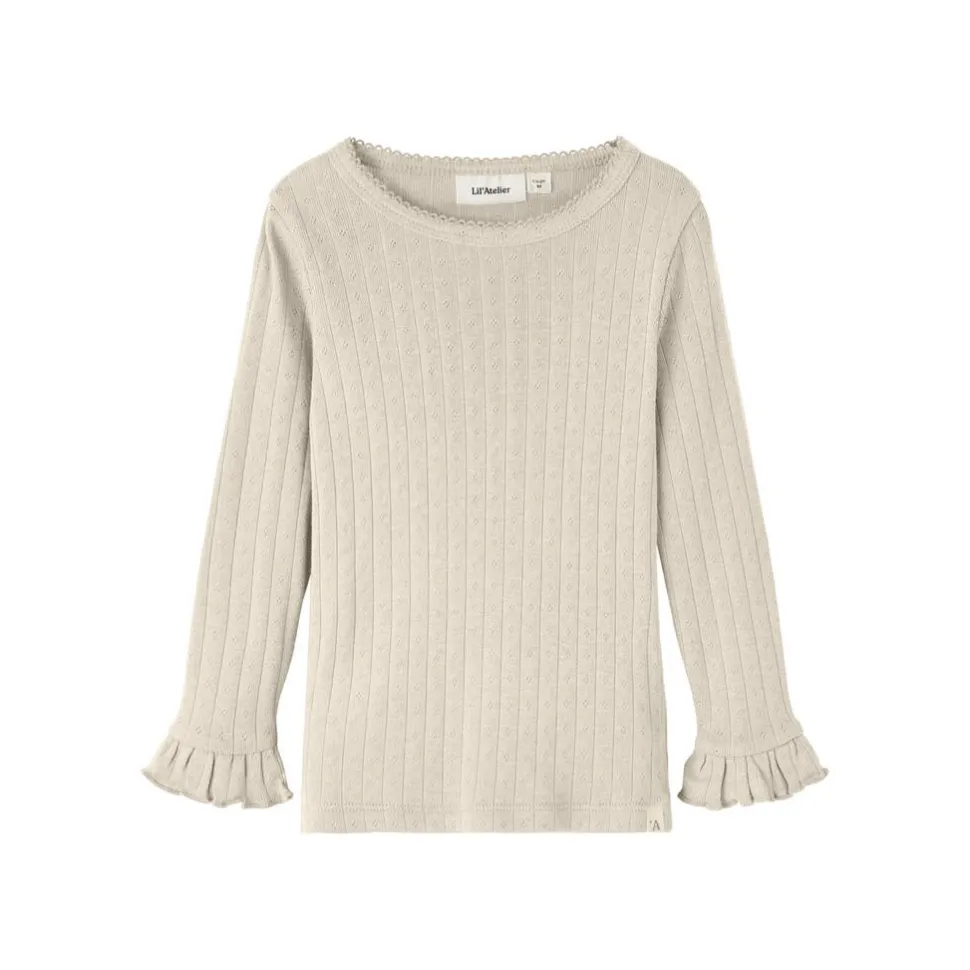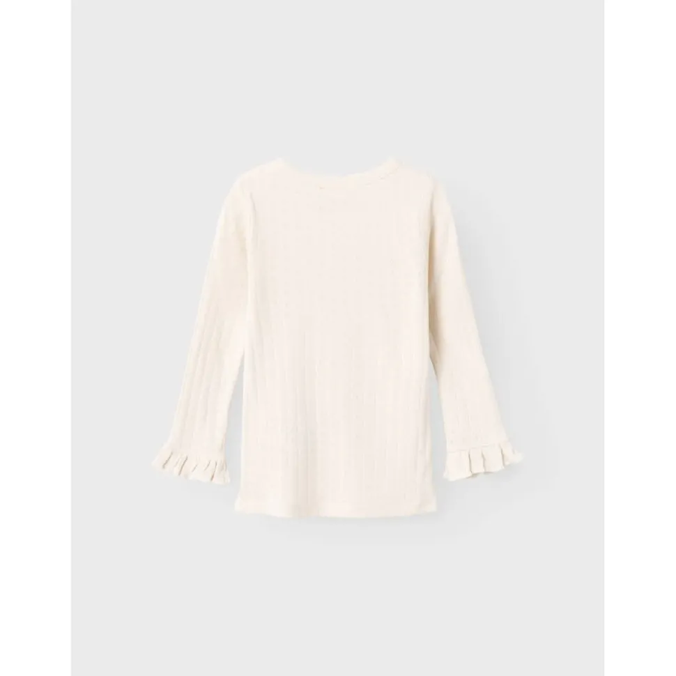 Mooie Longsleeve Met Frill Randje Aan De Mouwen. De Shirts Zijn Van Een Zachte Katoen Gemaakt, Met Een Mooi Romantisch Pointelle Design. De Shirts Vallen Ruim.