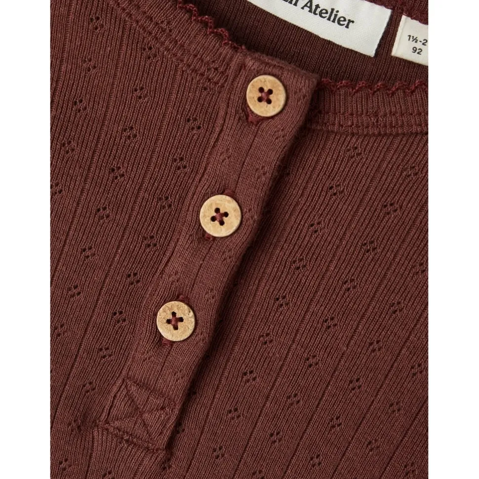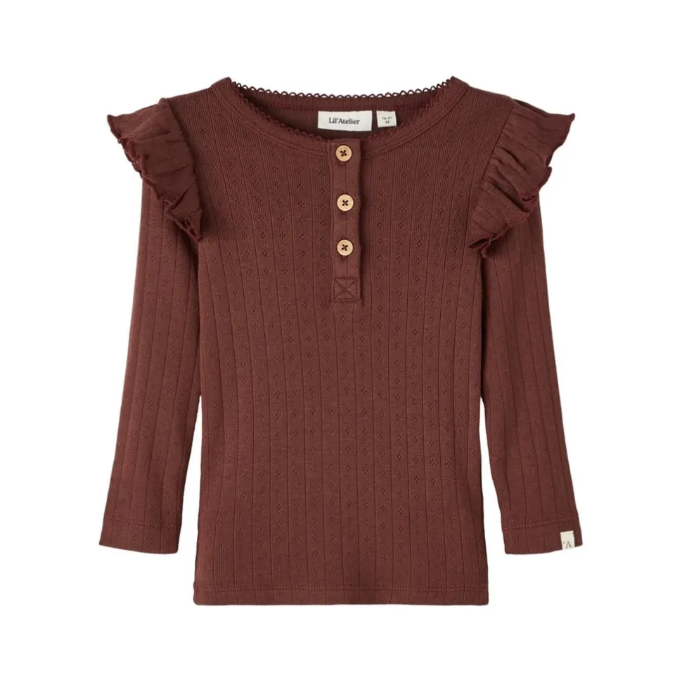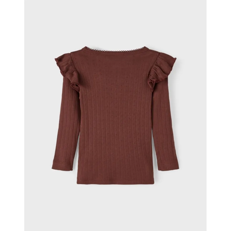 Mooie Rum Raisin Kleurige Top Met Ruffle Schouders En Houten Knoopjes Voor. De Drop Stitching Techniek Zorgde Voor Een Prachtig Broderie Patroontje In De Stof.