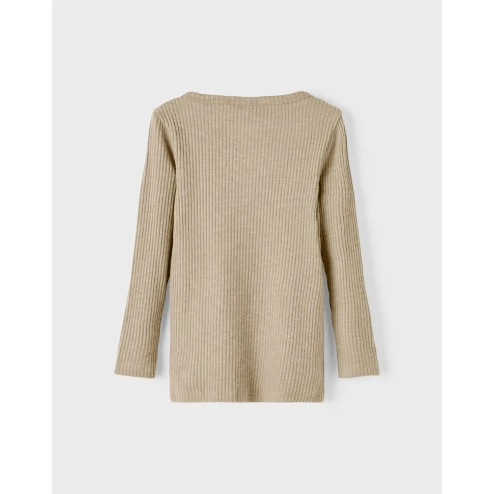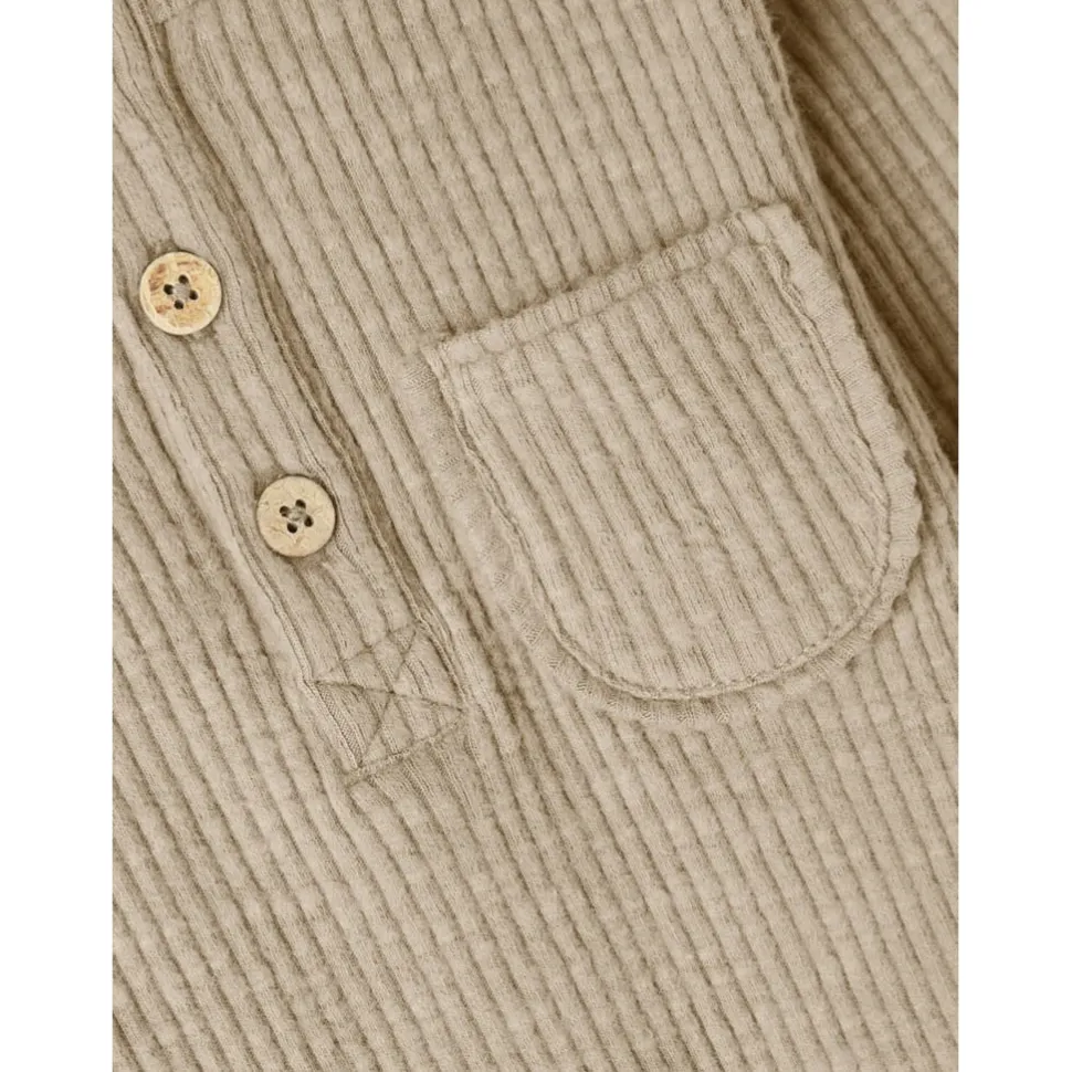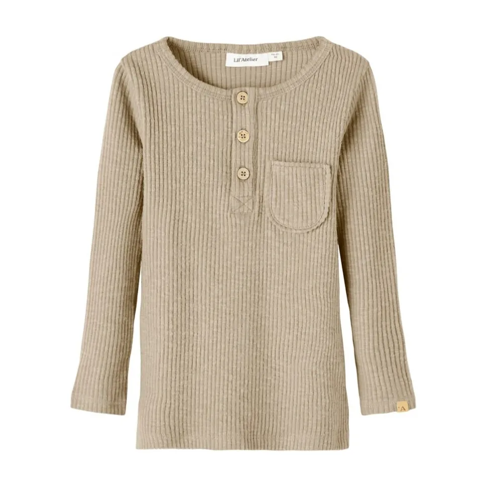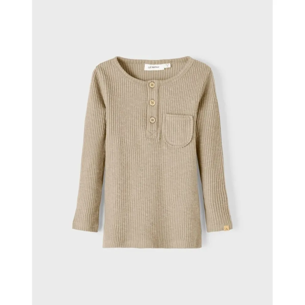 Mooie Zachte Rib Longsleeve In Beige-Grijze Kleur. Met Houten Knoopjes En Borstzakje.