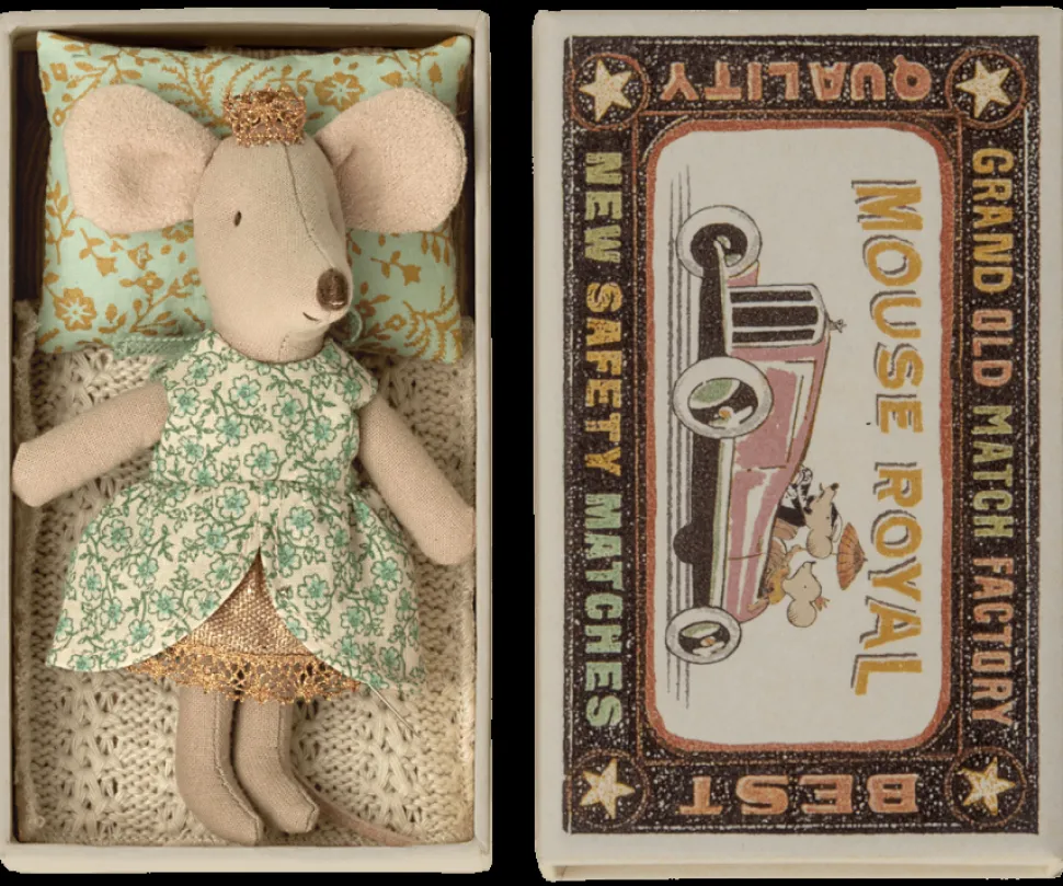 Zo Lief Is Dit Kleine Zus-Prinsesje Van Maileg. Ze Zit In Een Mooi Luciferdoosje Met Dekentje En Kussentje En Draagt Een Mooi Jurkje Met Kroontje Op Haar Hoofd.