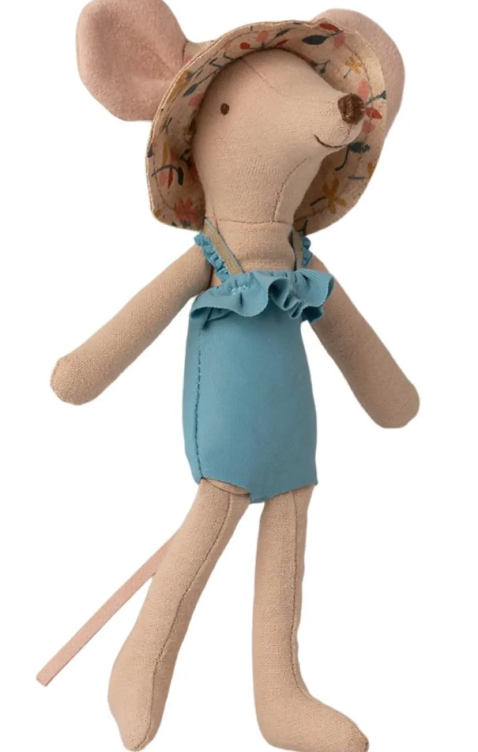 Mama Muis Vindt Het Zo Leuk Om Met Haar Kroost Naar Het Strand Te Gaan. Ze Heeft Een Prachtig Blauw Badpakje En Een Mooie Zonnehoed. Haar Strandhokje Heeft Een Mooie Koraalkleur.