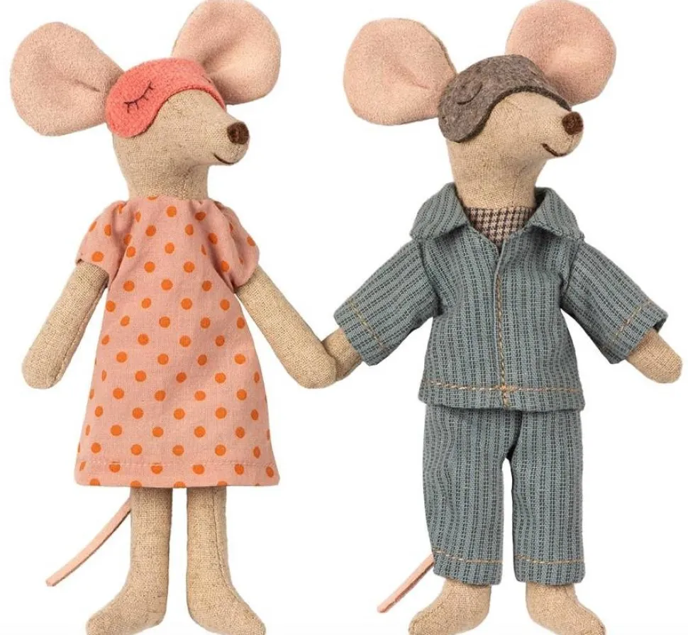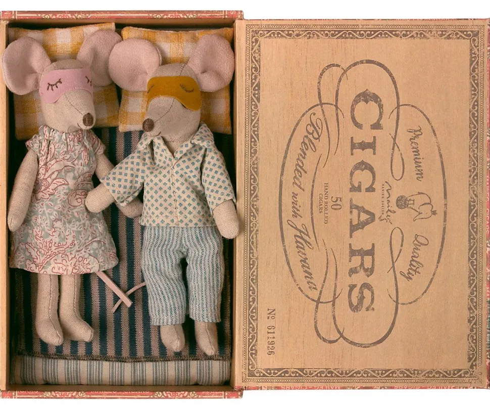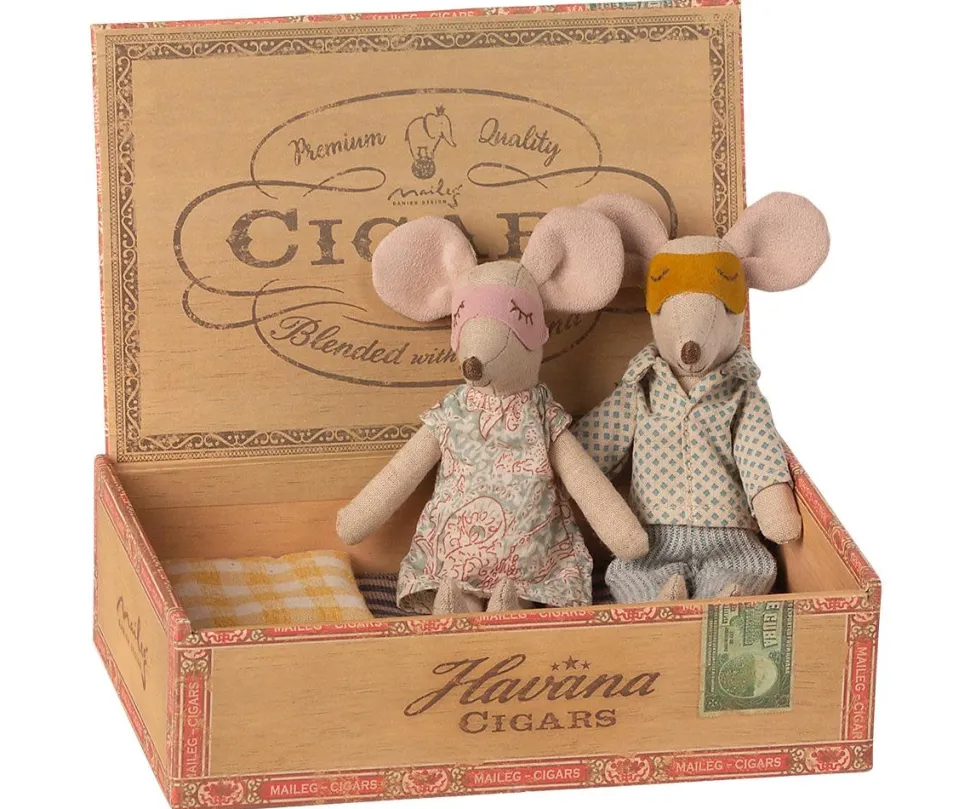Prachtige Papa En Mama Muis Van Maileg Die In Hun Schattige Muizen Pyjama’S Slapen In Hun Sigarendoos Bedje. Inclusief Slaapmaskertjes. Gemaakt Van Biologisch Katoen.