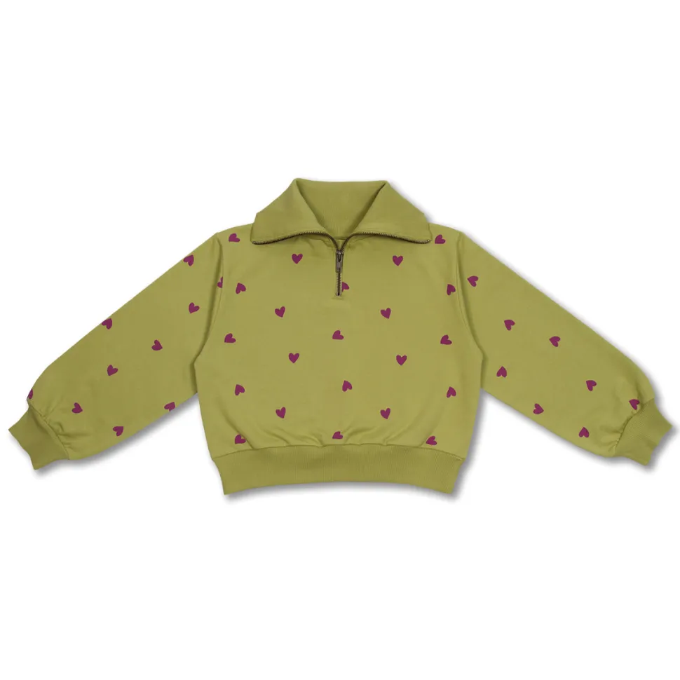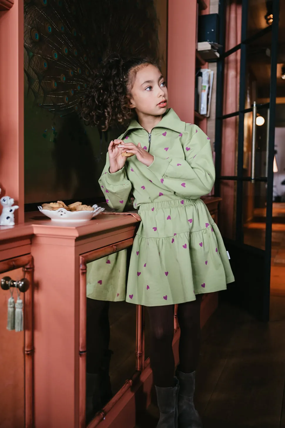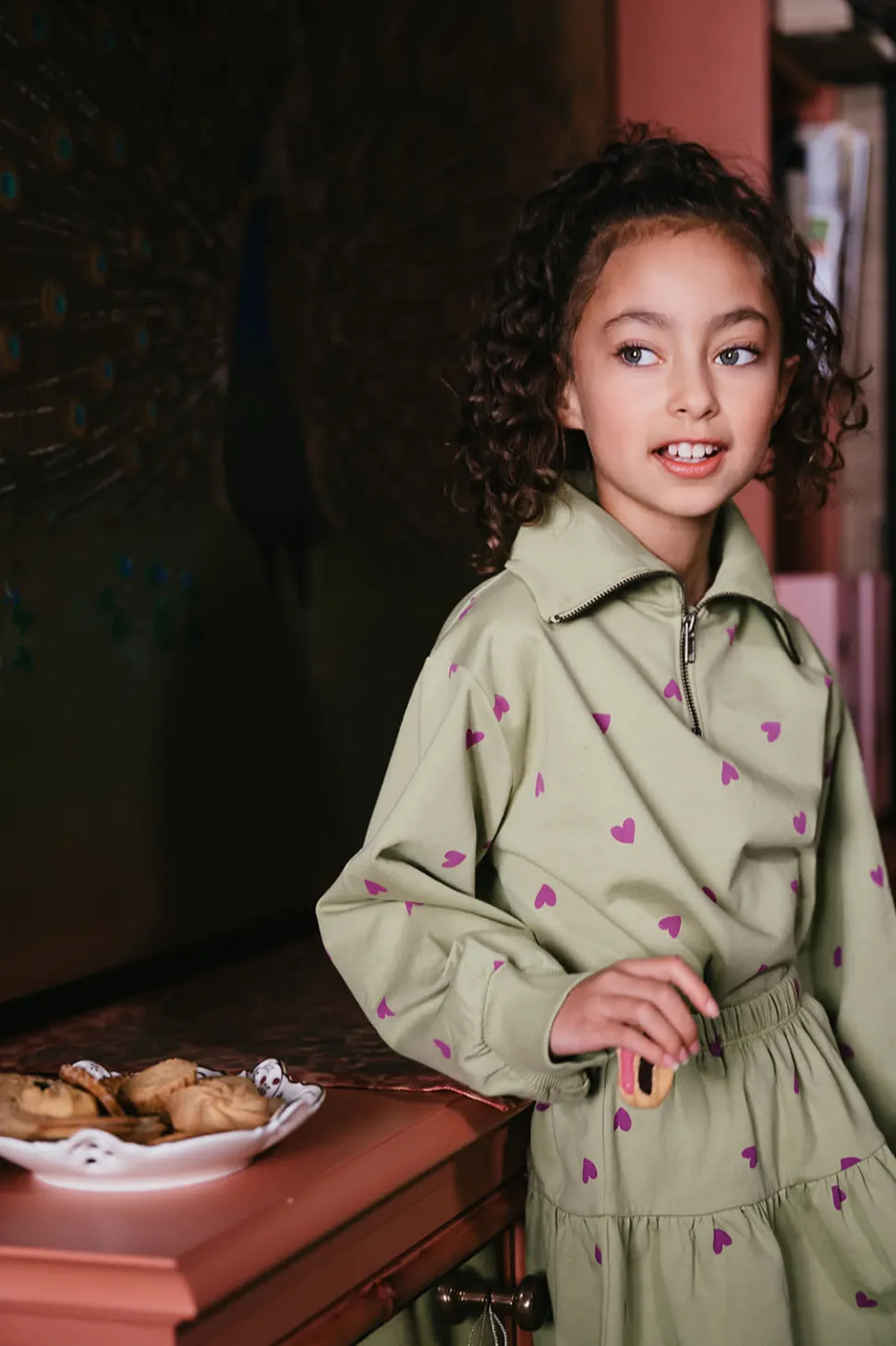 Oh Wat Een Te Gekke Trui Is Dit! Deze Zipper Sweater In Coole Groene Kleur Met Paarse Hartjes Is Echt Een Tof Statement Item. Het Kraagje Draag Je Zo Hoog Als Je Zelf Fijn Vindt.