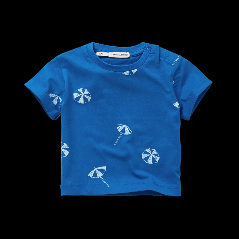 Transporteer Jezelf Naar Het Strand Van Positano Waar Gestreepte Parasols De Show Stelen. Met Het Sproet & Sprout T-Shirt Umbrella Print In Kobaltblauw Met Witte Strandparasol Print Vier Je De Zomer (Alvast). Dit Blauwe Kinder T-Shirt Met Parasols Heeft Een Hoge Ronde Hals, Korte Mouwen En Een Regular Fit. Ideaal: In De Babymaten Heeft Dit Blauwe Parasol T-Shirt Voor Kinderen Handige Drukknopen Aan De Halsboord, Zodat Aan- En Uittrekken ‘A Piece Of Cake’ Is. Gemaakt Van 100% Zacht Biologisch Katoen.